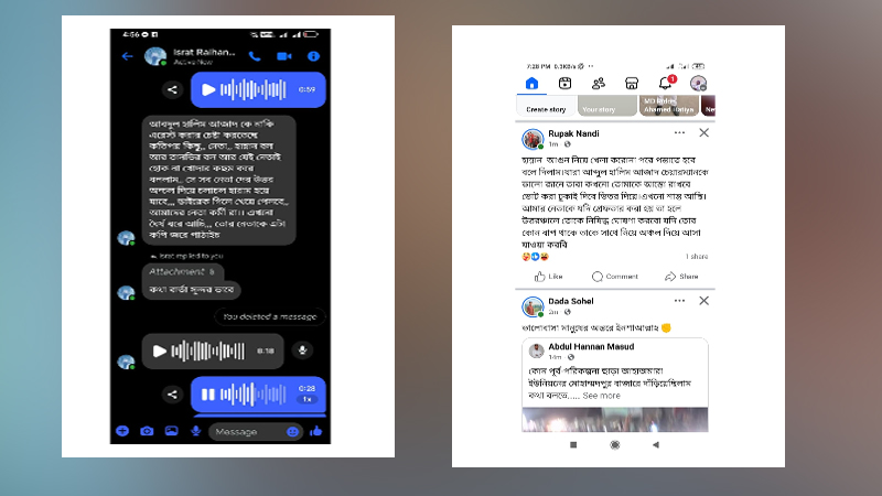 বৃহস্পতিবার (১৮ ডিসেম্বর) রাতে ওই হুমকির স্ক্রিনশটগুলো ভাইরাল হয়। ভাইরাল হওয়া স্ক্রিনশটে দেখা যায়, মেসেঞ্জারে ইসরাত রায়হান অমি লিখেছেন, আবদুল হালিম আজাদকে নাকি গ্রেপ্তার করার চেষ্টা করছে কতিপয় নেতা। হান্নান বল আর তানভির বল যেই নেতাই হোক, খোদার কসম করে বললাম, উত্তর অঞ্চলে চলাচল হারাম হয়ে যাবে। আমাদের নেতাকর্মীরা ডাইরেক গিলে খেয়ে ফেলবে। এখনো ধৈর্য ধরে আছি। তোর নেতাকে এটা কপি করে পাঠাইছ।