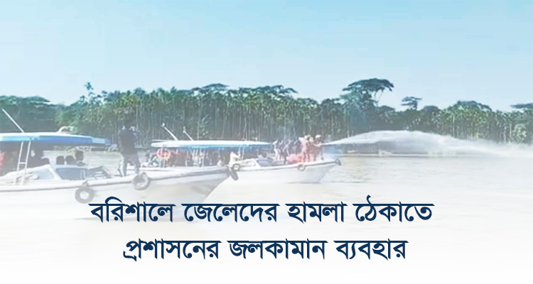নিজস্ব প্রতিবেদক, বরিশাল: মা ইলিশ সংরক্ষণ অভিযানে জেলেদের হামলা ঠেকাতে বরিশালে প্রথমবারের মতো জলকামান ব্যবহার করা হয়েছে। ফায়ার সার্ভিসের সদস্যদের নিয়ে জেলেদের হামলা ঠেকাতে এ অভিনব পদ্ধতি গ্রহণ করেছে প্রশাসন। সোমবার (২০ অক্টোবর) বিকেল থেকে বরিশাল জেলার হিজলা উপজেলার মেঘনা নদীতে অবৈধভাবে ইলিশ শিকার বন্ধে জলকামান ব্যবহার করা হয়।
