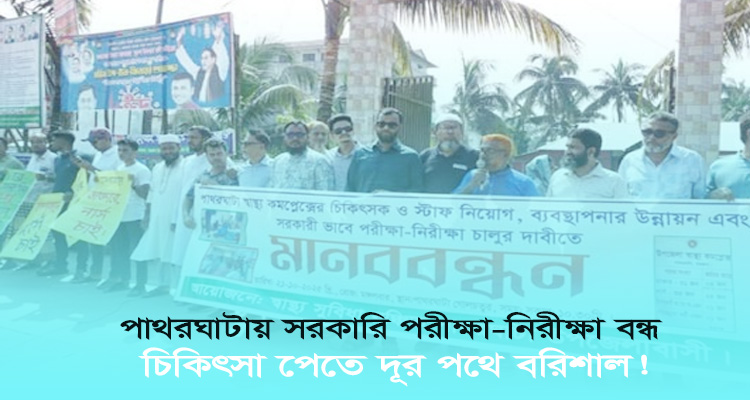 নিজস্ব প্রতিবেদক : বরগুনা পাথরঘাটায় স্বাস্থ্য কমপ্লেক্সে চিকিৎসা স্টাফ নিয়োগ ও সরকারি পরীক্ষা-নিরীক্ষা চালুর দাবিতে মানববন্ধন অনুষ্ঠিত হয়েছে। মঙ্গলবার (২১ অক্টোবর) বেলা ১১টায় পাথরঘাটা গোল চত্বরে অনুষ্ঠিত মানববন্ধনে দুই শতাধিক স্বাস্থ্যসেবা সুবিধা বঞ্চিত মানুষ অংশগ্রহণ করেন।