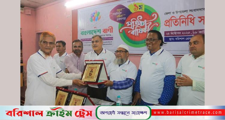 শুক্রবার (২৪ অক্টোবর) বরিশাল প্রেসক্লাবে আয়োজিত প্রতিনিধি সম্মেলনে এই সম্মাননা স্মারক তুলে দেন দৈনিক বাংলাদেশ বাণী’র প্রধান সম্পাদক ও বরিশাল প্রেসক্লাব সভাপতি অধ্যক্ষ আমিনুল ইসলাম খসরু, সম্পাদক আযাদ আলাউদ্দিন, প্রকাশক অ্যাড. শাহে আলম এবং বার্তা প্রধানসহ পত্রিকার ঊর্ধ্বতন কর্মকর্তারা।
