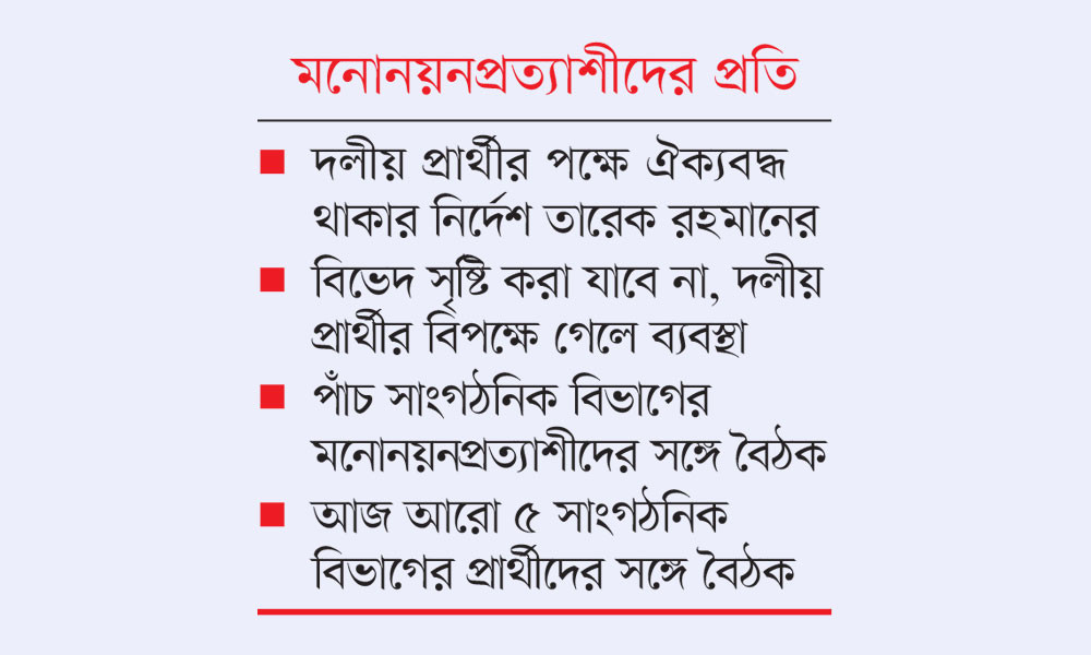 আজ সোমবার দলের বাকি পাঁচ সাংগাঠনিক বিভাগ ঢাকা, রাজশাহী, খুলনা, বরিশাল ও সিলেটের মনোনয়নপ্রত্যাশীদের সঙ্গে বৈঠক করবেন তারেক রহমান।