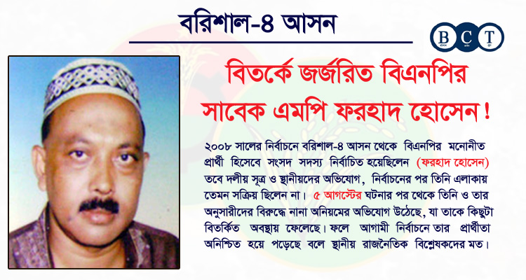 ২০০৮ সালের নির্বাচনে বরিশাল-৪ আসন থেকে বিএনপির মনোনীত প্রার্থী হিসেবে সংসদ সদস্য নির্বাচিত হয়েছিলেন ফরহাদ হোসেন। তবে দলীয় সূত্র ও স্থানীয়দের অভিযোগ, নির্বাচনের পর তিনি এলাকায় তেমন সক্রিয় ছিলেন না। ৫ আগস্টের ঘটনার পর থেকে তিনি ও তার অনুসারীদের বিরুদ্ধে নানা অনিয়মের অভিযোগ উঠেছে, যা তাকে কিছুটা বিতর্কিত অবস্থায় ফেলেছে। ফলে আগামী নির্বাচনে তার প্রার্থীতা অনিশ্চিত হয়ে পড়েছে বলে স্থানীয় রাজনৈতিক বিশ্লেষকদের মত।