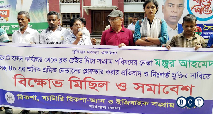নিজস্ব প্রতিবেদক : সিলেটে বাসদ কার্যালয়ে ব্লক রেইড দিয়ে সংগ্রাম পরিষদের নেতা মঞ্জুর আহমেদসহ ৪০ জনেরও বেশি শ্রমিক নেতাকে গ্রেফতারের প্রতিবাদে বরিশালে বিক্ষোভ মিছিল ও সমাবেশ অনুষ্ঠিত হয়েছে।