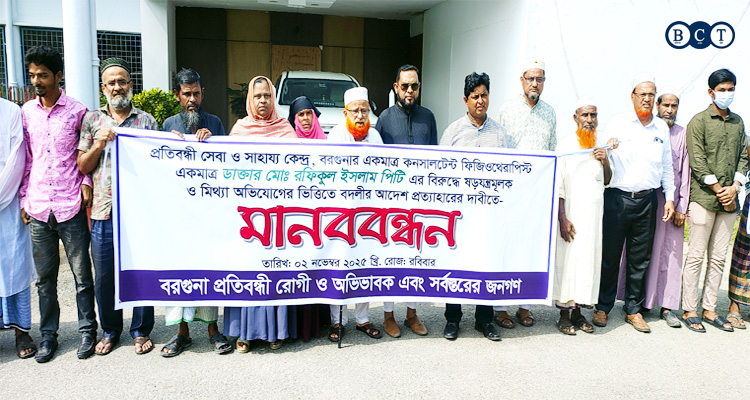 ইফতেখার শাহীন, বরগুনা। প্রতিবন্ধী সেবা ও সাহায্য কেন্দ্র, বরগুনার কনসালটেন্ট ফিজিও থেরাপিষ্ট ডাক্তার মোঃ রফিকুল ইসলামের বিরুদ্ধে ষড়যন্ত্রমূলক মিথ্যা অভিযোগ প্রত্যাখ্যান ও বদলীর আদেশ বাতিলের দবীতে মানববন্ধন ও স্মারকলিপি প্রদান করেছে সচেতন মহল ও ভূক্তভোগী রোগীরা।
