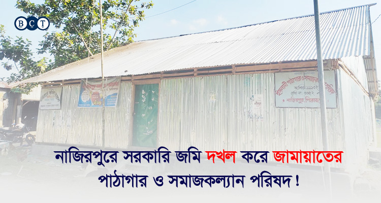 বাজারের অন্তত ১৫ শতাংশ সরকারি জমিতে নতুন করে একটি লম্বা টিনশেড ঘর তোলা হয়েছে। একই ঘরের এক প্রবেশপথে ঝুলছে দুটি সাইনবোর্ড—একটিতে নাজিরপুর দাখিল মাদরাসা, অন্যটিতে ‘ইসলামী পাঠাগার ও সমাজকল্যাণ পরিষদ’ লেখা। এই ঘরে প্রতিনিয়ত আসেন জামায়াতের স্থানীয় ও শীর্ষ নেতারা। এখানেই অনুষ্ঠিত হচ্ছে বিভিন্ন ধর্মীয় ও সামাজিক কর্মসূচি। সেই কার্যক্রমের ছবি কালের কণ্ঠের কাছে রক্ষিত আছে।