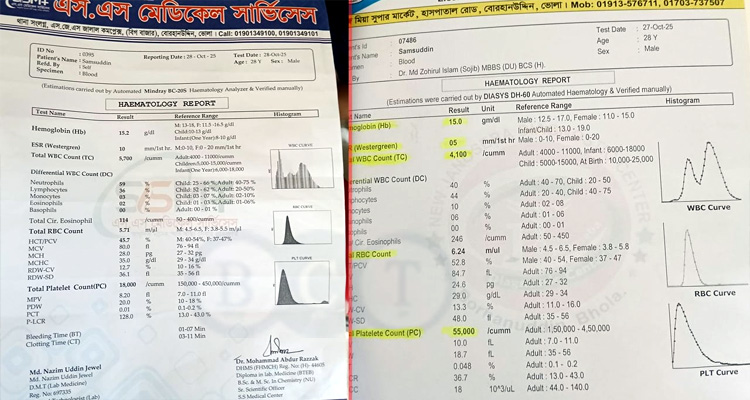 টেস্টের রিপোর্টে প্লাটিলেটের পরিমাণ ৫৫,০০০ পেয়ে ডাক্তার তাকে ডেঙ্গু পজিটিভ শনাক্ত করেন।