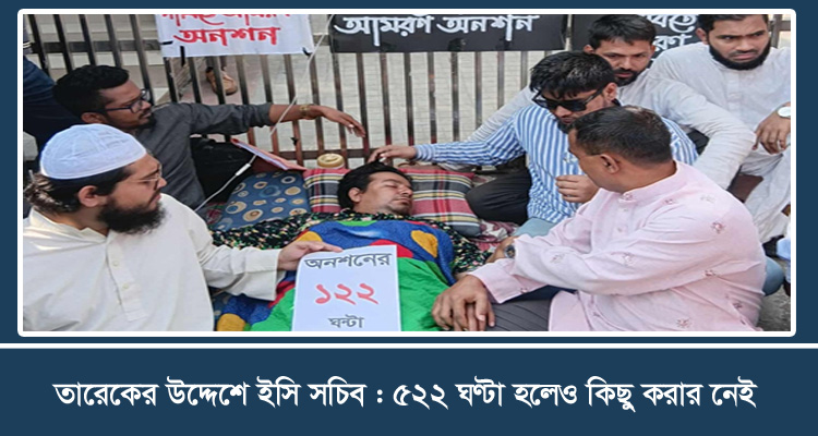 নিজস্ব প্রতিবেদক : রাজনৈতিক দল হিসেবে নিবন্ধনের দাবিতে ১২৩ ঘণ্টা ধরে নির্বাচন কমিশনের (ইসি) প্রধান ফটকের সামনে আমরণ অনশন কর্মসূচি পালন করে আসছেন আমজনতার দলের সদস্যসচিব তারেক রহমান। কিন্তু এ কর্মসূচি ৫২২ ঘণ্টা হলেও কিছু করার নেই বলে জানিয়েছেন ইসির সিনিয়র সচিব আখতার আহমেদ। আজ রবিবার নির্বাচন কমিশন সচিবালয়ে তিনি এ মন্তব্য করেন।