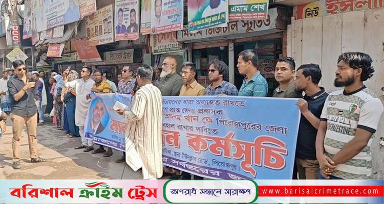 মঙ্গলবার (১১ নভেম্বর) সকাল ১০টা থেকে দুপুর ১২টা পর্যন্ত শহরের টাউন ক্লাব রোডে অনুষ্ঠিত এ মানববন্ধনে অংশ নেন বিভিন্ন শ্রেণি-পেশার মানুষ, সামাজিক ও সাংস্কৃতিক সংগঠনের প্রতিনিধি, ব্যবসায়ী, শিক্ষক, ছাত্র-ছাত্রীসহ সাধারণ জনসাধারণ। বক্তারা বলেন, জেলা প্রশাসক মোহাম্মদ আশরাফুল আলম খান যোগদানের পর থেকে শিক্ষা, স্বাস্থ্য, অবকাঠামো, পরিবেশ সংরক্ষণ ও প্রশাসনিক সেবার মান উন্নয়নসহ জেলাজুড়ে উল্লেখযোগ্য অগ্রগতি হয়েছে। তাঁর আন্তরিকতা ও দক্ষ নেতৃত্বে প্রশাসনের প্রতি মানুষের আস্থা বেড়েছে। তাঁদের দাবি, উন্নয়নের ধারাবাহিকতা বজায় রাখতে তাঁকে পিরোজপুরের জেলা প্রশাসক পদে বহাল রাখা হোক। মানববন্ধনে বক্তব্য রাখেন সমাজসেবক রেজাউল হক রিয়াজ, পিরোজপুর প্রেস ক্লাব সভাপতি এডভোকেট এস এম রেজাউল ইসলাম শামীম, সমাজসেবক আফজাল হোসেন টিপু, সাবেক ছাত্রনেতা খায়রুল ইসলাম বাবু, সমাজসেবক আলিফ আহমেদ রাজিব, টিম পজিটিভ পিরোজপুর সভাপতি হাবিবুর রহমান, সাধারণ সম্পাদক জুবায়ের আল মামুন, ব্যবসায়ী মো. আসলাম শেখ, শ্রমিক নেতা রাজ্জাক ফকির ও সোহেল শেখ। শান্তিপূর্ণভাবে মানববন্ধন শেষে কর্মসূচি সমাপ্ত হয়।