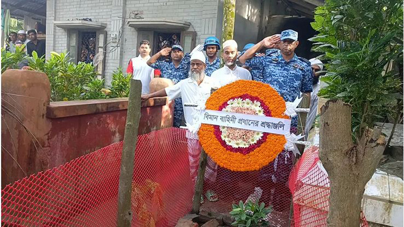 শনিবার (২৬ জুলাই) বিকেল ৪টার দিকে বরিশালের মেহেন্দিগঞ্জ উপজেলার চানপুর ইউনিয়নের দেশখাগকাটা গ্রামের পারিবারিক কবরস্থানে পুষ্পস্তবক অর্পণ করে বিমানবাহিনীর একটি প্রতিনিধিদল।
