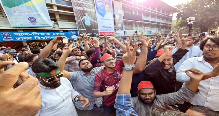 এসময় 'এ মুহূর্তে খবর এলো, শেখ হাসিনার ফাঁসি হলো', 'দড়ি লাগলে দড়ি নে, শেখ হাসিনার ফাঁসি দে'- স্লোগান দিতে থাকেন জনতা।