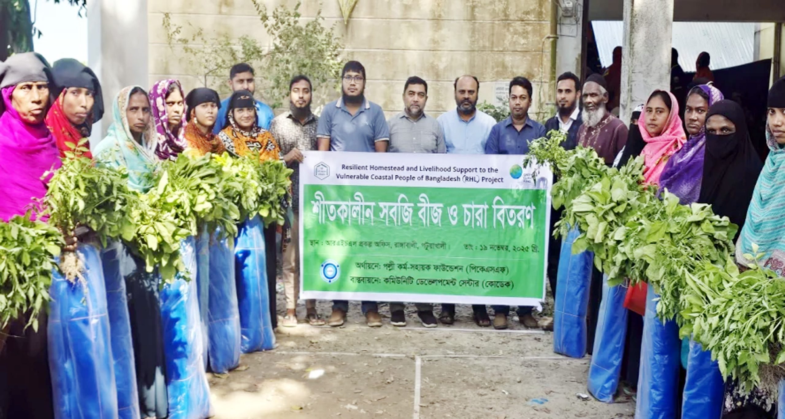 বাংলাদেশের ঝুঁকিপূর্ণ উপকূলীয় জনগণের জন্য স্থিতিস্থাপক বসতবাড়ি ও জীবিকা সহায়তা (আরএইচএল) প্রকল্পের উদ্যোগে পল্লী কর্ম-সহায়ক ফাউন্ডেশনের (পিকেএসএফ) অর্থায়নে এবং কমিউনিটি ডেভেলপমেন্ট সেন্টারের (কোডেক) বাস্তবায়নে আয়োজিত এ অনুষ্ঠানে ২১০ জন উপকারভোগীর প্রতিজনকে বেগুন, টমেটোসহ চার প্রজাতির ১৩৫টি সবজি চারা এবং ১২০ গ্রাম শাকের বীজ ও বাগানের বেষ্টনীর জন্য ৫০ গজ নেট প্রদান করা হয়।