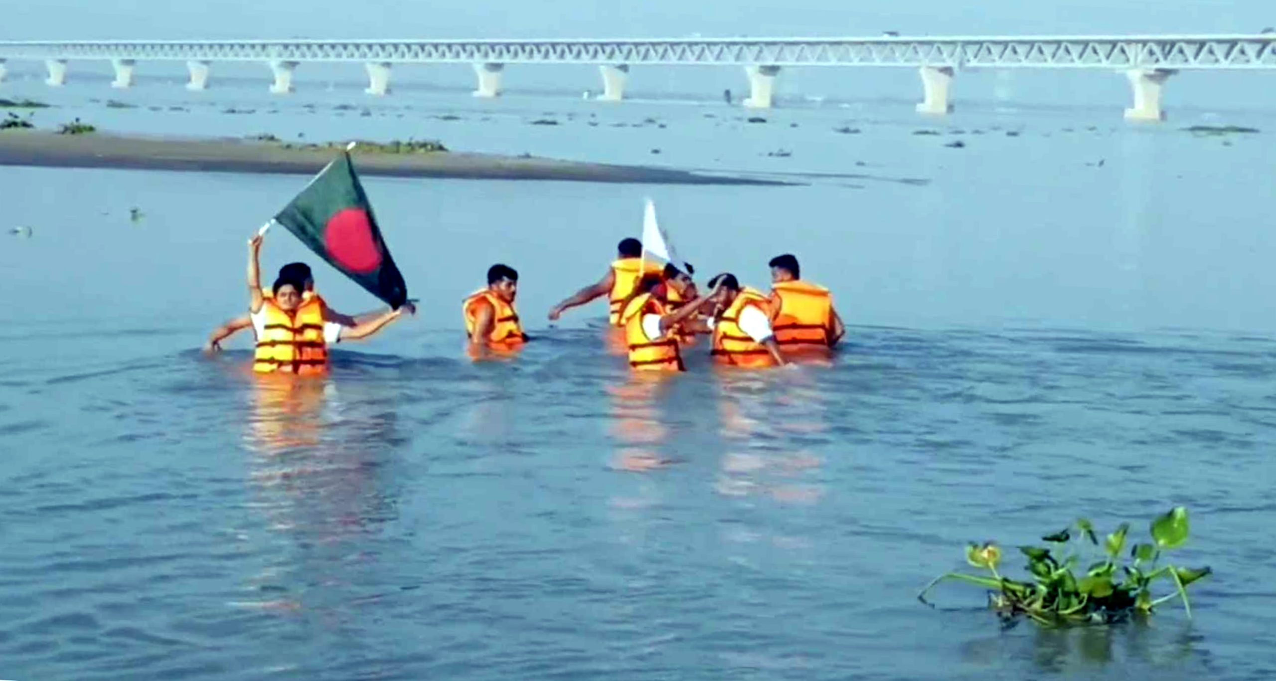 পরবর্তীতে ৬ কিলোমিটার নদীপথ সাতরে পার হওয়ার উদ্যোগ নেন লংমার্চকারীরা। তাদের মধ্যে ১০ জন সাঁতার শুরু করলেও কিছুদূর এগিয়ে নোমান হাওলাদার ও তানজিম নামে দুইজন অসুস্থ হয়ে পড়েন। স্থানীয়দের সহায়তায় তাদের উদ্ধার করে শিবচরের পাচ্চর এলাকার একটি বেসরকারি হাসপাতালে ভর্তি করা হয়।