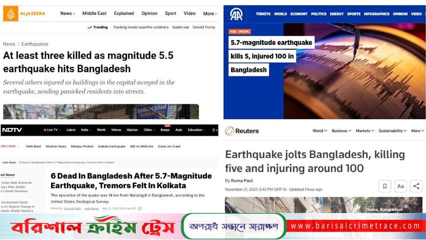 নিজস্ব প্রতিবেদক: রাজধানীসহ দেশের বিভিন্ন স্থানে শুক্রবার সকাল ১০টা ৩৮ মিনিটে ভূমিকম্প আঘাত হানে। দেশের বিভিন্ন স্থান থেকে হতাহতের খবর পাওয়া যাচ্ছে। এ পর্যন্ত ৭ জন নিহত হয়েছেন বলে জানা গেছে। আহত হয়েছেন দুই শতাধিকেরও বেশি মানুষ। তীব্র এ ভূমিকম্পের খবর গুরুত্ব দিয়ে প্রকাশ করেছে আন্তর্জাতিক বিভিন্ন গণমাধ্যম।