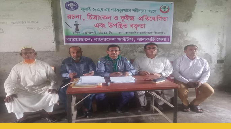 রিয়াজুল ইসলাম বাচ্চু, ঝালকাঠি: বাংলাদেশ স্কাউট ঝালকাঠি জেলা শাখার আয়োজনে জুলাই বিপ্লবের শহীদদের স্মরণে রচনা, চিত্রাংকন, কুইজ ও উপস্থিত বক্তৃতা প্রতিযোগিতা অনুষ্ঠিত হয়েছে। মঙ্গলবার (২৯ জুলাই) সকাল ১০ টায় ঝালকাঠি সরকারি বালক বিদ্যালয়ের হলরুমে ঝালকাঠি জেলার প্রাথমিক ও মাধ্যমিক স্তরের শিক্ষা প্রতিষ্ঠানগুলো থেকে ইউনিট লিডারবৃন্দের নেতৃত্বে কাব স্কাউটরা অংশ গ্রহণ করে।