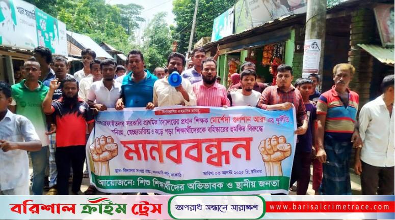রোববার (৩ জুলাই) সকালে পৌরসভার ৭ নম্বর ওয়ার্ডের ওই বিদ্যালয়ের সামনে ঘন্টাব্যাপী এ মানববন্ধন অনুষ্ঠিত হয়। মানববন্ধনে অংশ নেন শিক্ষার্থীদের অভিভাবক ও স্থানীয় এলাকাবাসী। মানববন্ধনে বক্তব্য দেন, অভিভাবক সবুজ খান, আবুল হোসেন খান, মুসফিক খান, ইলিয়াস পঞ্চায়েত ও মিরাজ হাওলাদারসহ আরো অনেকে। বক্তারা অভিযোগ করেন, প্রধান শিক্ষক গুলশান আরা নিয়মিতভাবে অভিভাবকদের সঙ্গে দুর্ব্যবহার করেন এবং বিদ্যালয়ের পিছিয়ে কিছু শিক্ষার্থীকে নিজ প্রতিষ্ঠানে না রেখে পার্শ্ববর্তী বিদ্যালয়ে পাঠিয়ে দেন।