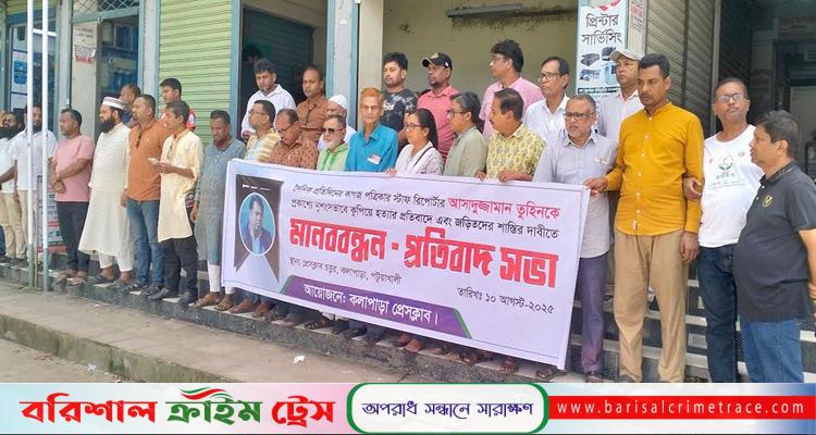 এস এম আলমগীর হোসেন, কলাপাড়াঃ দৈনিক প্রতিদিনের কাগজ পত্রিকার স্টাফ রিপোর্টার আসাদুজ্জামান তুহিনকে প্রকাশ্যে নৃশংসভাবে কুপিয়ে হত্যার প্রতিবাদে এবং জড়িতদের দ্রুত গ্রেপ্তার ও দৃষ্টান্তমূলক শাস্তির দাবিতে কলাপাড়ায় মানববন্ধন ও প্রতিবাদ সভা অনুষ্ঠিত হয়েছে।