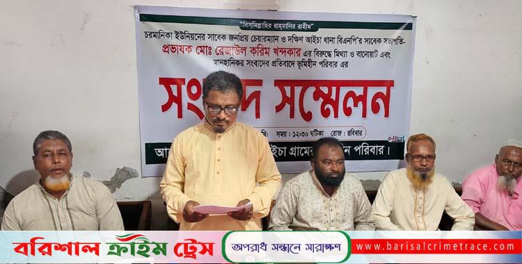 চরফ্যাশন(ভোলা) প্রতিনিধি।। ভোলার চরফ্যাশন উপজেলার চরমানিকা ইউনিয়নের সাবেক চেয়ারম্যান ও দক্ষিণ আইচা থানা বিএনপির সাবেক সভাপতি প্রভাষক মো. রেজাউল করিম খন্দকারের বিরুদ্ধে কয়েকটি পত্রিকা সহ ফেইসবুকে ফেক আইডি দিয়ে মিথ্যা অপপ্রচারের বিরুদ্ধে সংবাদ সম্মেলন করেছে দক্ষিণ চর আইচা ভূমিহীন পরিবার।