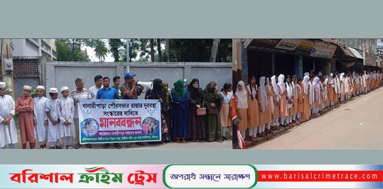 রাহাদ সুমন, বানারীপাড়া: বরিশালের বানারীপাড়ায় পৌর শহরের খানাখন্দে বেহাল হয়ে পড়া সড়কগুলো দ্রুত সংস্কারের দাবিতে মানববন্ধন অনুষ্ঠিত হয়েছে। রোববার (১০ আগস্ট) সকাল ১০টায় বানারীপাড়া বালিকা মাধ্যমিক বিদ্যালয়ের সামনের সড়কে উজ্জীবন মানব উন্নয়ন সংস্থার উদ্যোগে এ মানববন্ধন কর্মসূচি পালণ করা হয়।