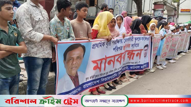 প্রাথমিক বৃত্তি পরীক্ষায় বেসরকারি স্কুল বাদ দেওয়ার পরিপত্র স্থগিতের দাবিতে বরিশালে মানববন্ধন