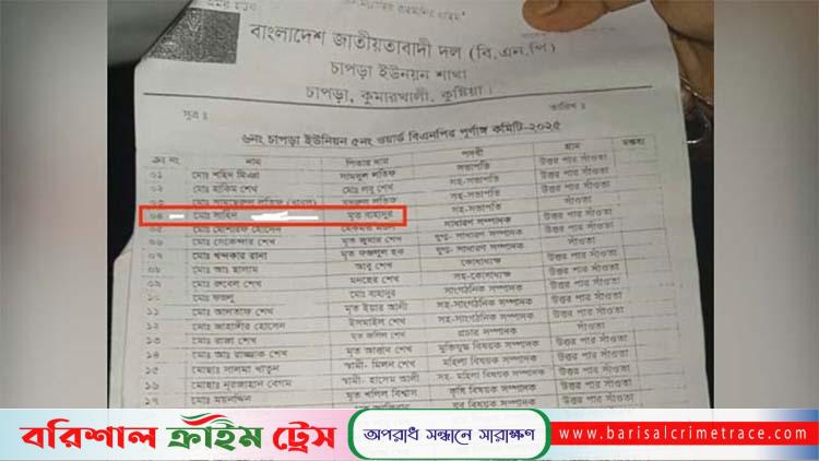 নিজস্ব প্রতিবেদক, বরিশাল: প্রায় তিন বছর আগে স্ট্রোক করে মারা যান কুষ্টিয়ার কুমারখালীর সাহিদ। অথচ নবগঠিত বিএনপির কমিটিতে মৃত ওই ব্যক্তিকে সহ সভাপতির পদ দেওয়া হয়েছে। এ নিয়ে ব্যাপক আলোচনা সমালোচন চলছে।
