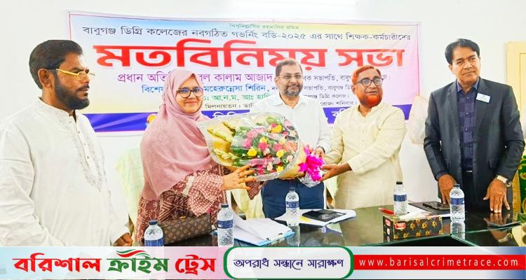 বাবুগঞ্জ (বরিশাল) প্রতিনিধিঃ বরিশালের বাবুগঞ্জ ডিগ্রি কলেজে নবগঠিত গভর্নিং বডি ২০২৫ এর সঙ্গে শিক্ষক ও কর্মচারীদের এক মতবিনিময় সভা অনুষ্ঠিত হয়েছে। শনিবার (২২ আগস্ট) কলেজের শিক্ষক মিলনায়তনে অনুষ্ঠিত এ সভায় সভাপতিত্ব করেন কলেজের অধ্যক্ষ আ.ন.ম. মোঃ আব্দুল হালিম।