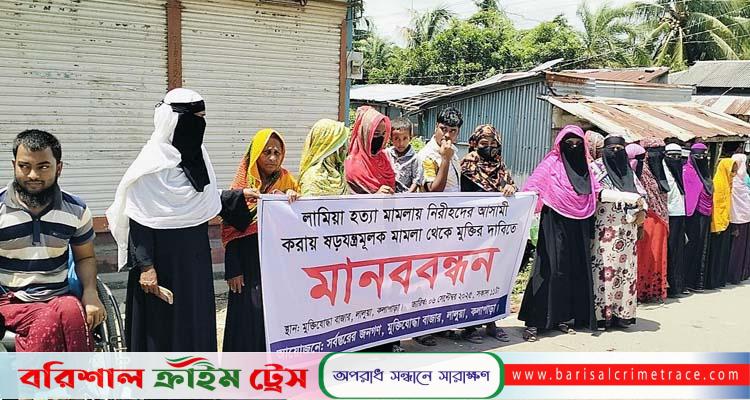 এস এম আলমগীর হোসেন, কলাপাড়াঃ পটুয়াখালীর কলাপাড়ায় লামিয়া হত্যার ঘটনায় নিরীহ গ্রামবাসীদের নামে মিথ্যা মামলা প্রত্যাহার ও প্রকৃত অপরাধীদের চিহ্নিত এবং তাদের গ্রেফতারের দাবিতে বিক্ষোভ মিছিল ও মানববন্ধন করেছে শতশত গ্রামবাসী।
