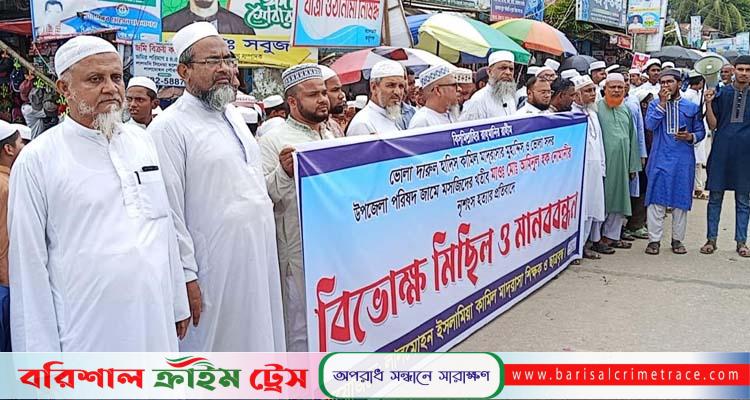 রোববার সকালে লালমোহন ইসলামিয়া কামিল মাদরাসার মাঠ থেকে বিক্ষোভ মিছিলটি বের হয়ে বাজারের প্রধান প্রধান সড়ক প্রদক্ষিণ করে চৌরাস্তার মোড়ে গিয়ে শেষ হয়। পরে সেখানে মানববন্ধন অনুষ্ঠিত হয়। মানববন্ধনে মাদরাসার বিভিন্ন স্তরের শিক্ষক-শিক্ষার্থীরা অংশগ্রহণ করেন।