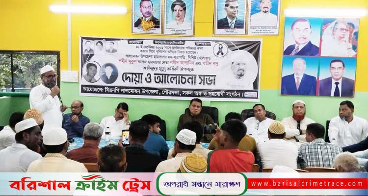 লালমোহন (ভোলা) প্রতিনিধি: ভোলার লালমোহন উপজেলায় পুলিশের গুলিতে শহীদ মুকুল, আল-আমিন ও নসুর মৃত্যুবার্ষিকী উপলক্ষ্যে দোয়া ও আলোচনা সভা অনুষ্ঠিত হয়েছে। মঙ্গলবার সকালে উপজেলা, পৌরসভা বিএনপি ও অঙ্গসংগঠনের আয়োজনে দলীয় কার্যালয়ে আলোচনা সভা ও দোয়া মোনাজাত অনুষ্ঠিত হয়।