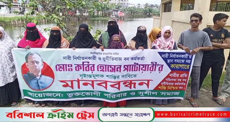 ভুক্তভোগী পরিবার ও সুশীল সমাজের ব্যানারে বৃহষ্পতিবার (১১ সেপ্টেম্বর) সকালে বরিশালের কাশিপুর বন সংরক্ষক কার্যালয়ের সামনে মানববন্ধন কর্মসূচি পালন করেছেন।