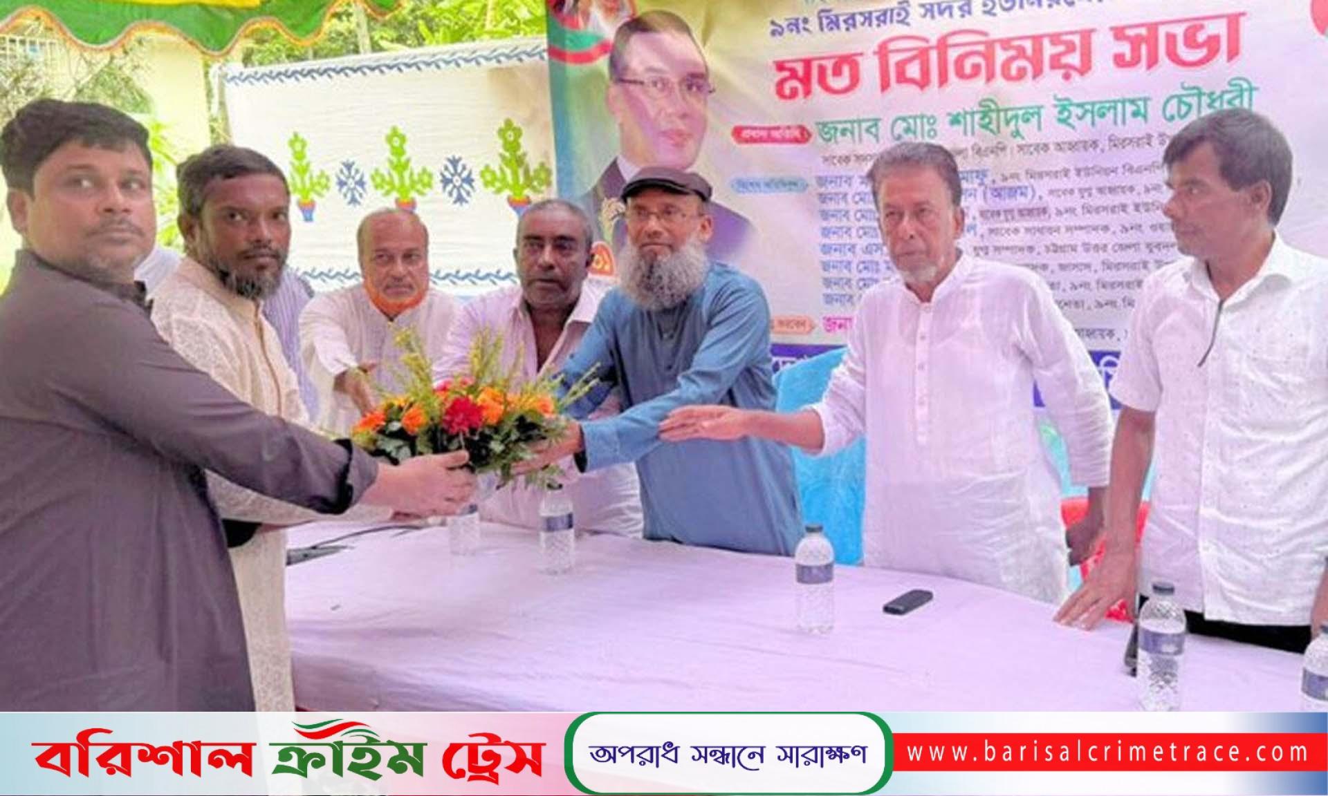 ৯ নং মিরসরাই সদর ইউনিয়ন বিএনপির সাবেক যুগ্ম আহ্বায়ক মো. ইমাম হোসেনের সভাপতিত্বে ও উপজেলা জাসাসের সাধারণ সম্পাদক মাসুম বিল্লাহর সঞ্চালনায় আয়োজিত এ মতবিনিময়সভায় প্রধান অতিথির বক্তব্য দেন মিরসরাই উপজেলা বিএনপির সাবেক আহ্বায়ক শাহীদুল ইসলাম চৌধুরী।