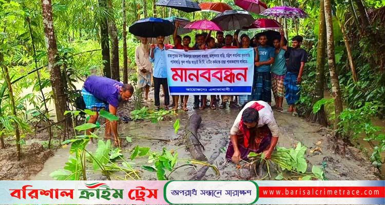 বৃহস্পতিবার দুপুরে তালুকদার বাড়ি এলাকায় এ মানববন্ধন অনুষ্ঠিত হয়। বৃষ্টি উপেক্ষা করে রাস্তায় প্রতীকী প্রতিবাদের অংশ হিসেবে বীজতলা ও কচুগাছ রোপণ করে এলাকাবাসী তাঁদের ক্ষোভ প্রকাশ করেন।