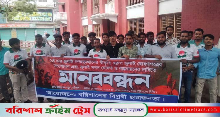 মানববন্ধন আয়োজক বরিশালের বিপ্লবী ছাত্র জনতা। বক্তারা তাদের বক্তব্যে বলেন, ২৪ জুলাই দেশের ইতিহাসে এক গুরুত্বপূর্ণ গণঅভ্যুত্থান হিসেবে চিহ্নিত। এই অভ্যুত্থান জাতির জন্য নতুন সূচনার পথ প্রশস্ত করেছে। তাই এর যথাযথ স্বীকৃতি, জুলাই ঘোষণাপত্রের সংশোধন এবং জুলাই সনদ বাস্তবায়ন অত্যন্ত জরুরি।