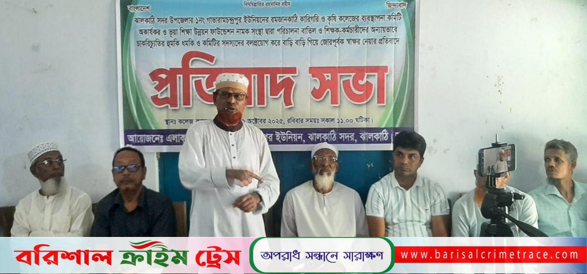 ঝালকাঠি প্রতিনিধি : ঝালকাঠি সদর উপজেলার গাভারামচন্দ্রপুর ইউনিয়নের রমজানকাঠি কারিগরি ও কৃষি কলেজ কর্তৃপক্ষের অনিয়ম ও স্বেচ্ছাচারিতার বিরুদ্ধে এলাকাবাসীর উদ্যোগে প্রতিবাদ সভা অনুষ্ঠিত হয়েছে।