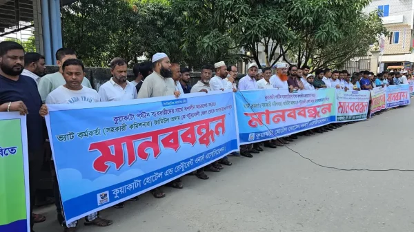 নিজস্ব প্রতিবেদক : মানববন্ধনে বক্তারা আরও ঘোষণা দেন, যদি দাবিটি অগ্রাহ্য করা হয়, তবে আগামী সোমবার সকাল থেকে কুয়াকাটার সব ব্যবসা প্রতিষ্ঠান অনির্দিষ্টকালের জন্য বন্ধ রাখা হবে। অন্যদিকে, অভিযোগের বিষয়ে