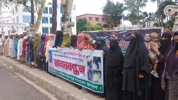 ভোলায় অসহায় পরিবারের উপর হামলার প্রতিবাদে মানববন্ধন