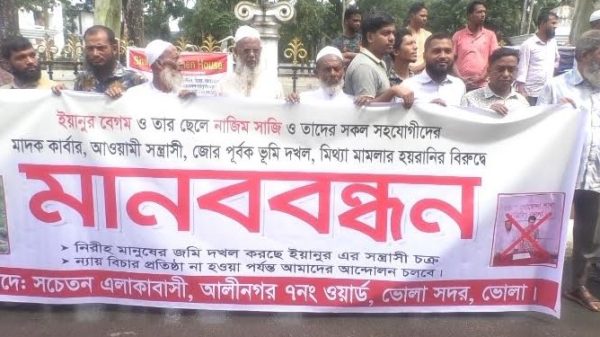 ভোলায় মাদক কারবারী ও ভূমিদস্যুদের গ্রেফতার করে শাস্তির দাবিতে মানববন্ধন