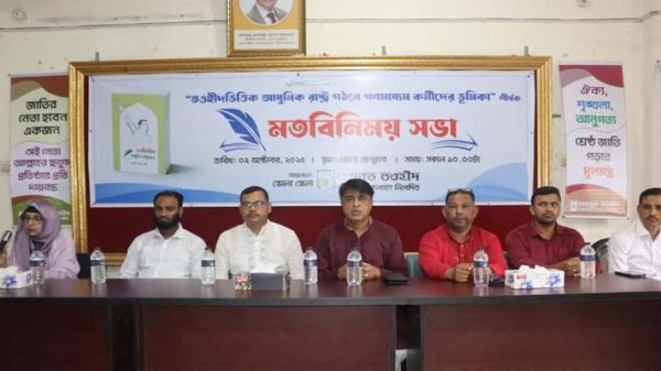 মোঃমনছুর আলম জেলা প্রতিনিধি ভোলাঃ জেলা হেযবুত তাওহীদের উদ্যোগে “তওহীদভিত্তিক আধুনিক রাষ্ট্র গঠনে গণমাধ্যমকর্মীদের ভূমিকা” শীর্ষক মতবিনিময় সভা অনুষ্ঠিত হয়েছে। বৃহস্পতিবার (২ অক্টোবর, ২০২৫) সকাল ১১টায় ভোলা প্রেসক্লাব মিলনায়তনে এ