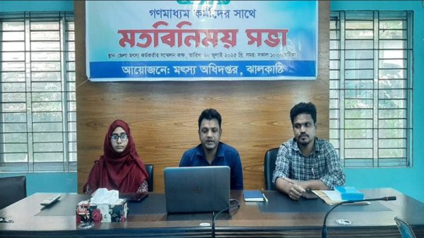 ঝালকাঠি প্রতিনিধি// “অভয়াশ্রম গড়ে তুলি, দেশী মাছে দেশ ভরি” শ্লোগান সামনে রেখে ঝালকাঠি মৎস্য অধিদপ্তরের আয়োজনে জাতীয় মৎস্য সপ্তাহ ২০২৫ উপলক্ষে গণমাধ্যম কর্মীদের সাথে মতবিনিময় সভা অনুষ্ঠিত হয়েছে। রবিবার (২০