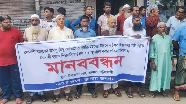 বাউফলে সোনালী ব্যাংক স্থানান্তর প্রক্রিয়ার বিরুদ্ধে গ্রাহকদের মানববন্ধন!