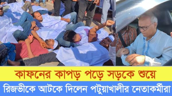 রোববার (১৬ নভেম্বর) সকাল সাড়ে ১০টায় পটুয়াখালী সদর উপজেলার কাজিরহাট বাজারে এই বিক্ষোভ অনুষ্ঠিত হয়। রুহুল কবির রিজভীর গাড়ি কাজিরহাট ব্রিজে পৌঁছালে নেতাকর্মীরা কাফনের কাপড় পরে সড়কে শুয়ে