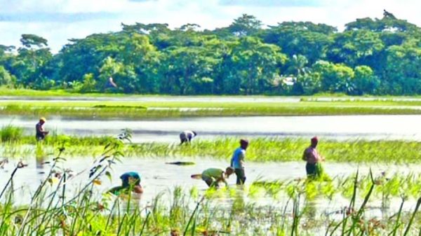 বাউফলে জমিতে আমন রোপণে ব্যস্ত কৃষক