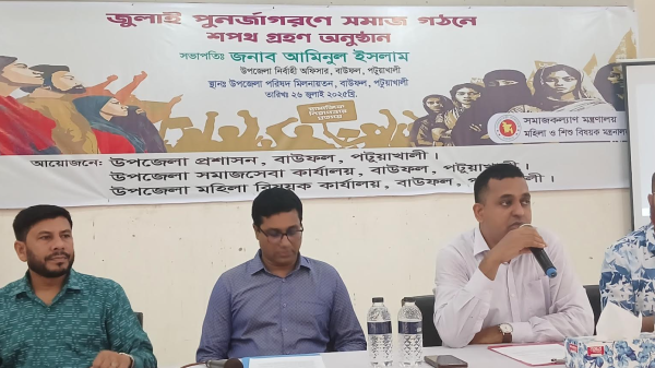 নিজস্ব প্রতিবেদক, বরিশাল: পটুয়াখালীর বাউফল  উপজেলা প্রশাসন ও সমাজসেবা অধিদপ্তরে আয়োজনে শনিবার (২৬ জুলাই) সকাল সাড়ে ১০টায় উপজেলা পরিষদ হলরুমে জুলাই পূর্ণজাগরণে সমাজ গঠনে লাখো কন্ঠে শপথপাঠ অনুষ্ঠান অনুষ্ঠিত হয়েছে। অনুষ্ঠানে