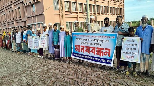 কলাপাড়ায় ভূমি অধিগ্রহণের টাকা আত্মসাৎ ও হয়রানির প্রতিবাদে মানববন্ধন