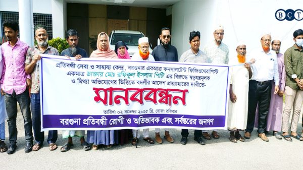 ইফতেখার শাহীন, বরগুনা। প্রতিবন্ধী সেবা ও সাহায্য কেন্দ্র, বরগুনার কনসালটেন্ট ফিজিও থেরাপিষ্ট ডাক্তার মোঃ রফিকুল ইসলামের বিরুদ্ধে ষড়যন্ত্রমূলক মিথ্যা অভিযোগ প্রত্যাখ্যান ও বদলীর আদেশ বাতিলের দবীতে মানববন্ধন ও স্মারকলিপি প্রদান