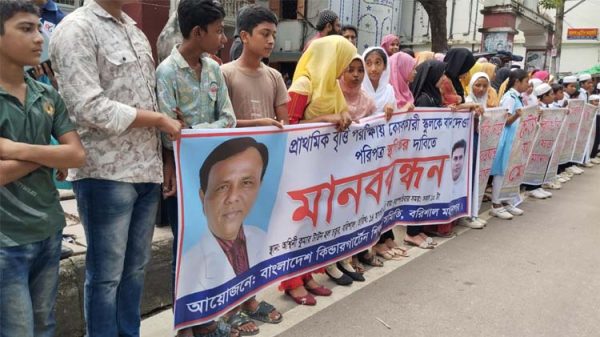 প্রাথমিক বৃত্তি পরীক্ষায় বেসরকারি স্কুল বাদ দেওয়ার পরিপত্র স্থগিতের দাবিতে বরিশালে মানববন্ধন