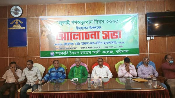 নিজস্ব প্রতিবেদক, বরিশাল: বরিশালের অন্যতম বিদ্যাপিঠ সরকারি সৈয়দ হাতেম আলী কলেজে জুলাই গনঅভ্যুত্থান দিবস উপলক্ষে আলোচনা সভা অনুষ্ঠিত হয়েছে। ৫ই আগষ্ট মঙ্গলবার সকাল ১১ ঘটিকায় কলেজের অডিটোরিয়াম কক্ষে এই আয়োজন