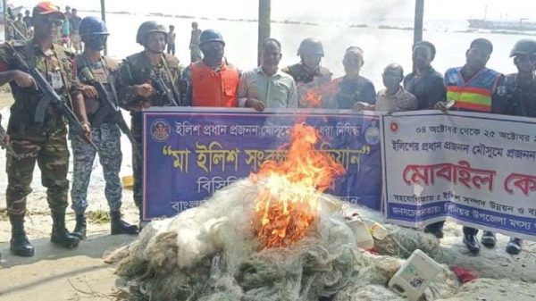 হিজলায় মেঘনা নদীতে যৌথ অভিযানে ২৭ জেলে আটক, ২২ লাখ মিটার কারেন্ট জাল জব্দ