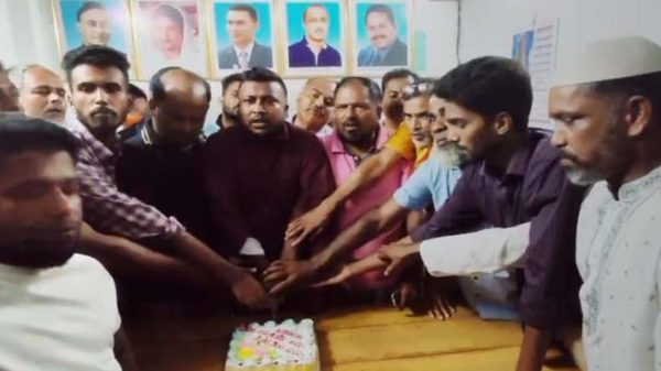 চরকাউয়ায় কেক কেটে এ্যাডঃ মজিবুর রহমান সরোয়ারের জন্মদিন পালন