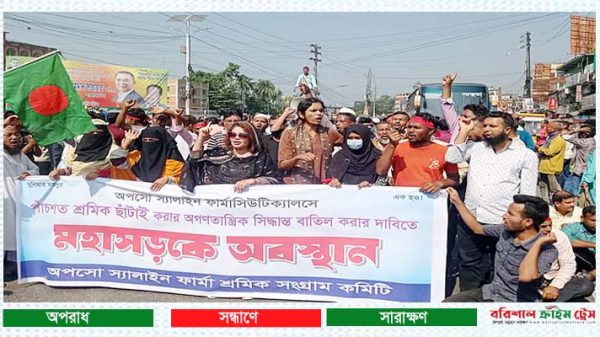 নিজস্ব প্রতিবেদক : বরিশালে অপসো স্যালাইন লিমিটেড কারখানার ৫৭০ জন শ্রমিককে ছাঁটাইয়ের প্রতিবাদে ঢাকা-বরিশাল মহাসড়ক অবরোধ করেছেন শ্রমিকেরা। আজ শনিবার দুপুর সোয়া ১২টার দিকে নগরের চৌমাথা এলাকার মহাসড়কে