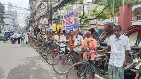 বরিশালে ব্যাটারি চালিত রিকশা বন্ধের দাবিতে বিক্ষোভ মানববন্ধন